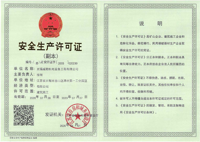安全生产许可证_无锡威勒机电设备工程有限公司